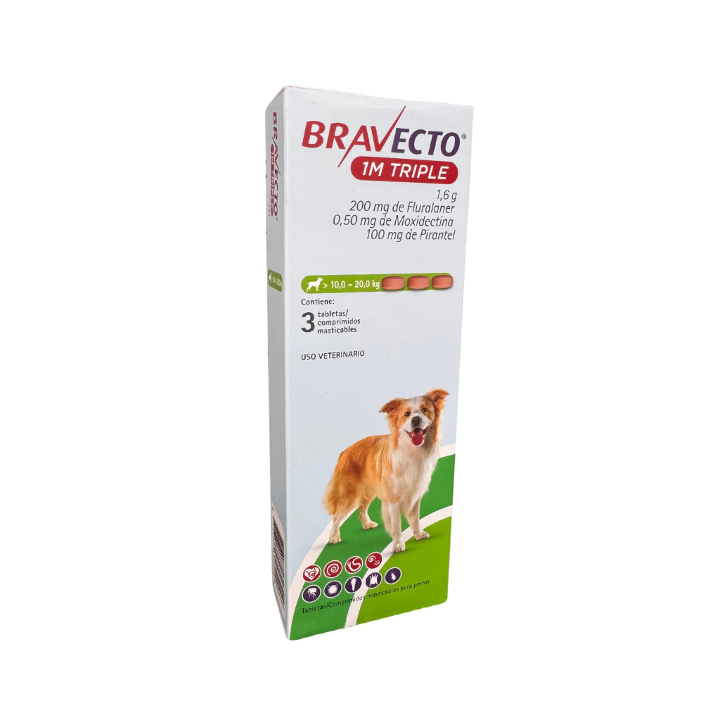 Bravecto Triple 10 a 20 kg es un tratamiento oral avanzado diseñado para proteger a perros pequeños y medianos contra pulgas, garrapatas, acaros y gusanos inetstinales asi como gusano del corazon. Cada caja contiene 3 tabletas, ofreciendo una protección eficaz y prolongada.